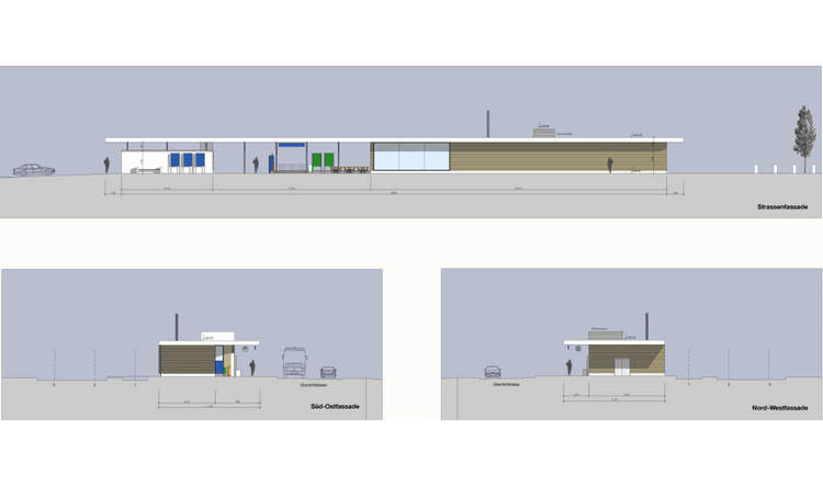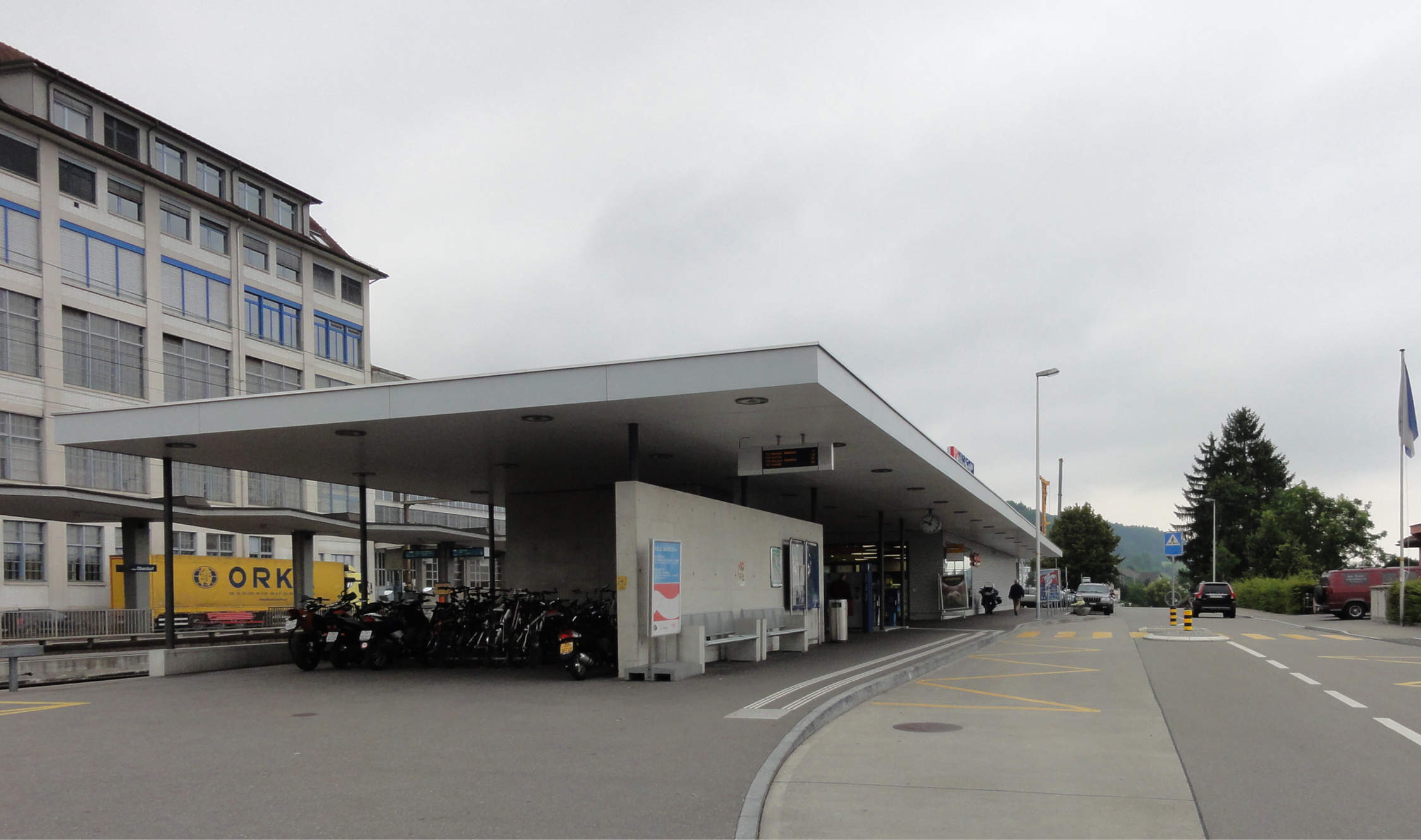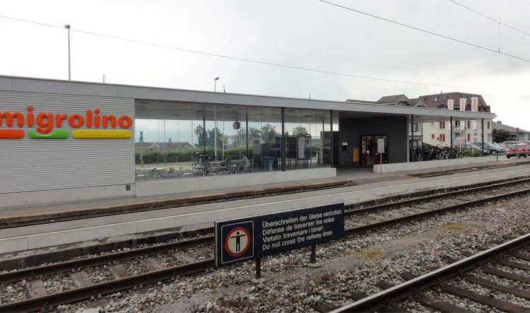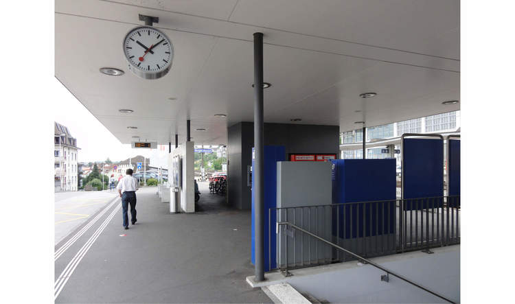Im Hinblick auf eine Gesamterneuerung der Bahnstation wurde das alte Aufnahmegebäude abgebrochen und das gesamte Areal grundlegend neu konzipiert und den neuen Bedürfnissen angepasst. Die neue Bahnhofplattform mit Shop, Kundencenter, Bushaltestelle und Veloabstellanlage wird durch eine grosszügige Dachkonstruktion zu einem Baukörper zusammengefasst und es resultiert ein attraktiver öffentlicher Aussenraum mit hohem Umsteigekomfort. Ergänzt wird die Anlage mit einer Erweiterung der bestehenden P+R-Anlage im Westen.