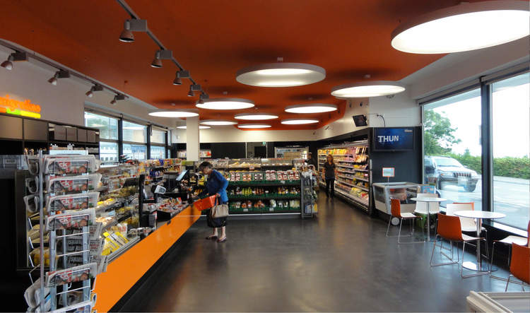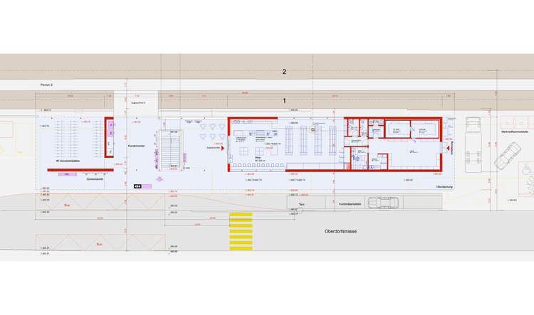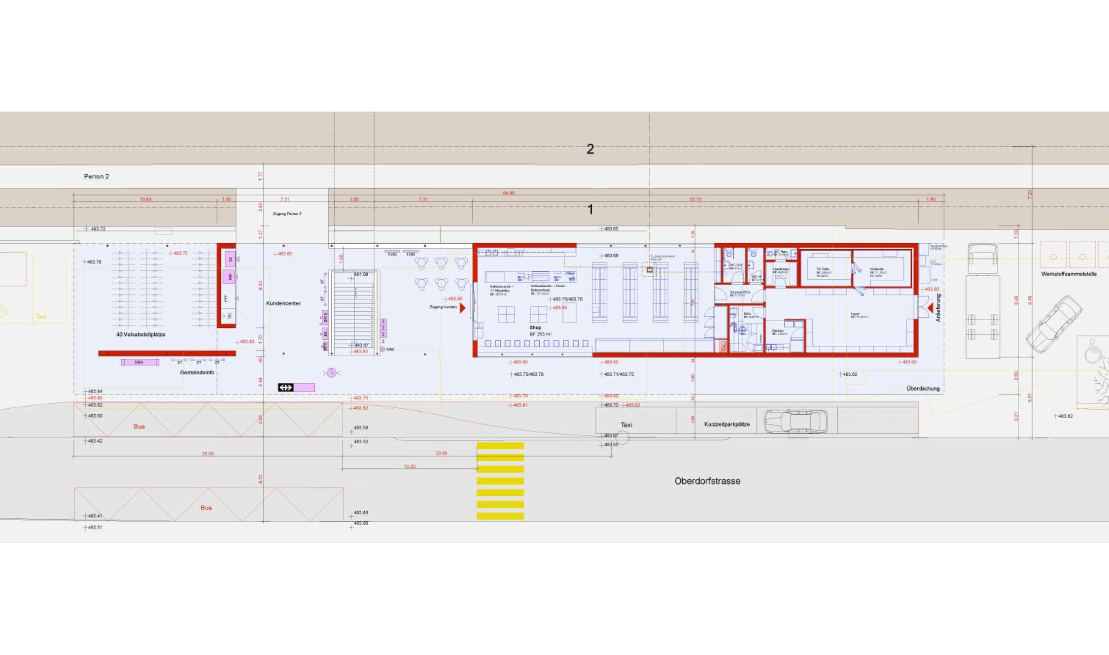 Der neue Shop mit einer Nettogeschossfläche von 250 m2 öffnet sich mit grosszügigen Verglasungen direkt zum Publikumsbereich bzw. Mittelperron und ist somit von allen Seiten direkt einsehbar. Der Verkaufsbereich mit Kiosk- Convenience- und Cafebereich wird ergänzt mit Aussensitzplätzen, welche die Bahnhofplattform zusätzlich beleben und aufwerten. In der an den Verkaufsbereich angrenzenden Raumschicht sind neben Lager- und Personalräumen behindertengerechte WC-Anlagen integriert, welche die bestehende WC-Anlage in der PU ersetzen.