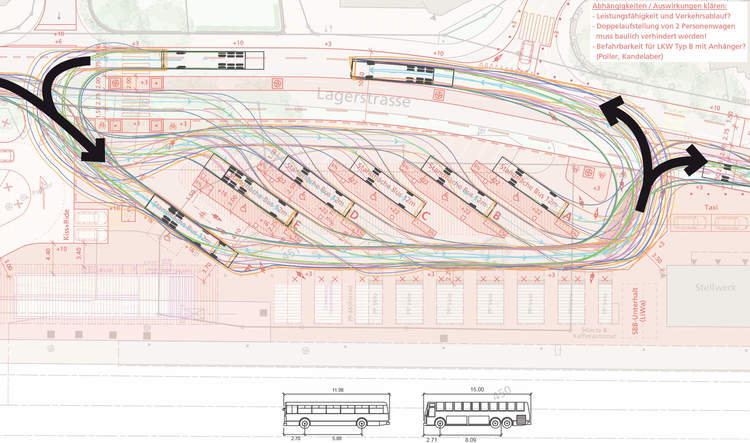 Die Neukonzeption sieht vor, dass der Bushof mit behindertengerechten Haltekanten im Bereich des heutigen Standortes angeordnet und vom motorisierten Individualverkehr entflechtet wird. Die Einzelperrons werden von einem zusammenhängenden Dach überspannt.