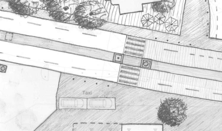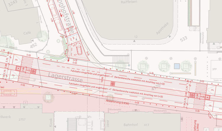Die Neuorganisation der übergeordneten Bahnhof-/Lagerstrasse sieht einen durchgehenden Mehrzweckstreifen, beidseitige Velostreifen und drei baulich geschützte Fussgängerstreifen vor. Im zentralen Strassenabschnitt wird die Fahrbahn angehoben und eingefärbt.