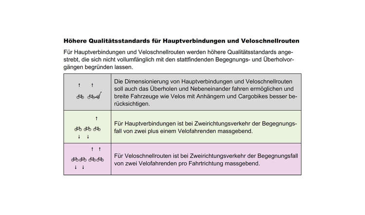 Ausschlaggebend für die Überarbeitung war vor allem der 2016 beschlossene Velonetzplan, der für Alltagsverbindungen je nach Bedeutung und Potential drei unterschiedliche Hierarchiestufen vorsieht: Nebenverbindungen, Hauptverbindungen und Pilotstrecken für Veloschnellrouten. Für Hauptverbindungen und Veloschnellrouten fehlten verbindliche Vorgaben zum Ausbaustandard. Zum anderen sollten die Velostandards an die Ziele der kantonalen Veloförderung und die aktuellen Normen angepasst werden. Im Hinblick auf den Ausbau einer bedarfsgerechten Veloinfrastruktur für alle Altersgruppen kommt zukunftsgerichteten Velostandards eine grosse Bedeutung zu. Mit der Aktualisierung wurde die Lücke zwischen der bisherigen Zweirad-Richtlinie aus dem Jahr 2012 sowie den neuen Anforderungen aus dem Velonetzplan geschlossen.