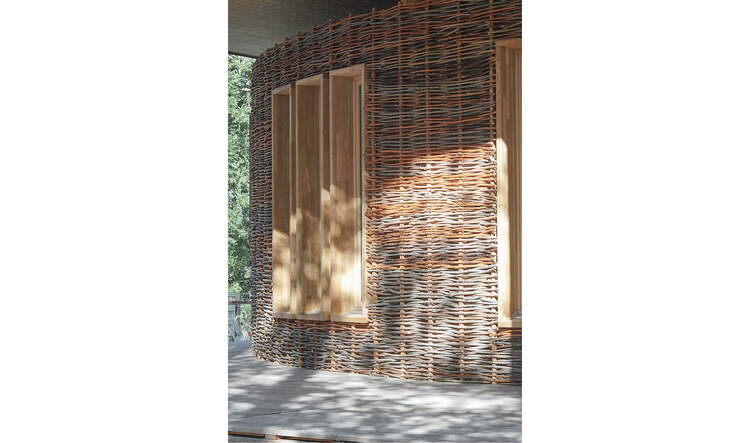 Die beiden elliptischen Gebäudeteile sind in Holzständerbauweise konstruiert und mit einem Weidengeflecht verkleidet. Dieses dient als mechanischer Schutz für die Tragkonstruktion und gleichzeitig auch als dekoratives Kleid und greift die Besonderheit des Ortes „Silberweide“ auf.