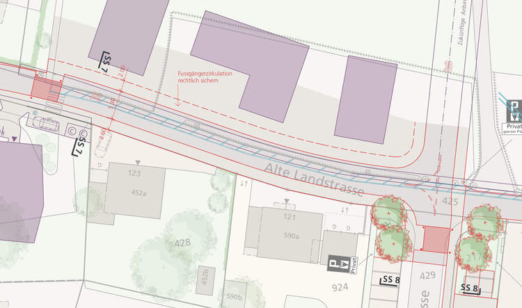 - Im Ost- und Westteil der Alten Landstrasse wird durchgehend eine Tempo-30-Zone eingeführt.