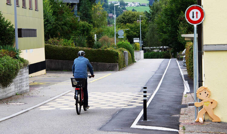 An Engstellen und im Bereich von Querungen wird die Fahrbahn auf 3.60 Meter reduziert. Dies verlangsamt den Verkehr und ermöglicht weiterhin die Begegnung zwischen einem Personenwagen und einem Velo. Bei Bedarf bleibt ein vorsichtiges Ausweichen auf das Trottoir möglich. Demontierbare Poller sorgen dafür, dass die Seitenbereiche nur punktuell und mit geringer Geschwindigkeit befahren werden können.